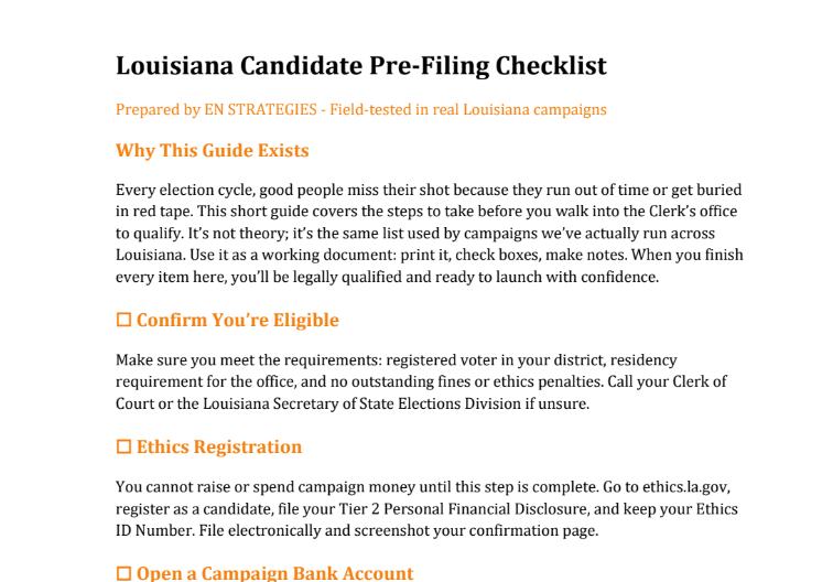 Download the Louisiana Candidate Pre-Filing Checklist. Field tested for real campaigns.